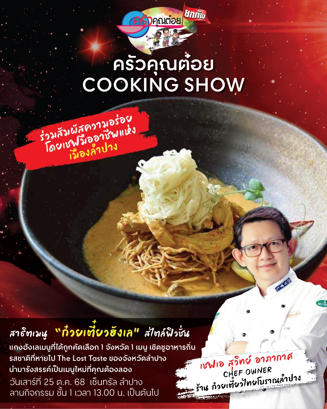 ไฮไลท์เด็ด “ก๋วยเตี๋ยวฮังเล”  ของอร่อยเมืองลำปาง “ครัวคุณต๋อยยกทัพ บุก เซ็นทรัล ลำปาง”  วันเสาร์ที่ 25 ตุลาคม 2568 เวลา 13.00 น. เป็นต้นไป ลานกิจกรรม ชั้น 1