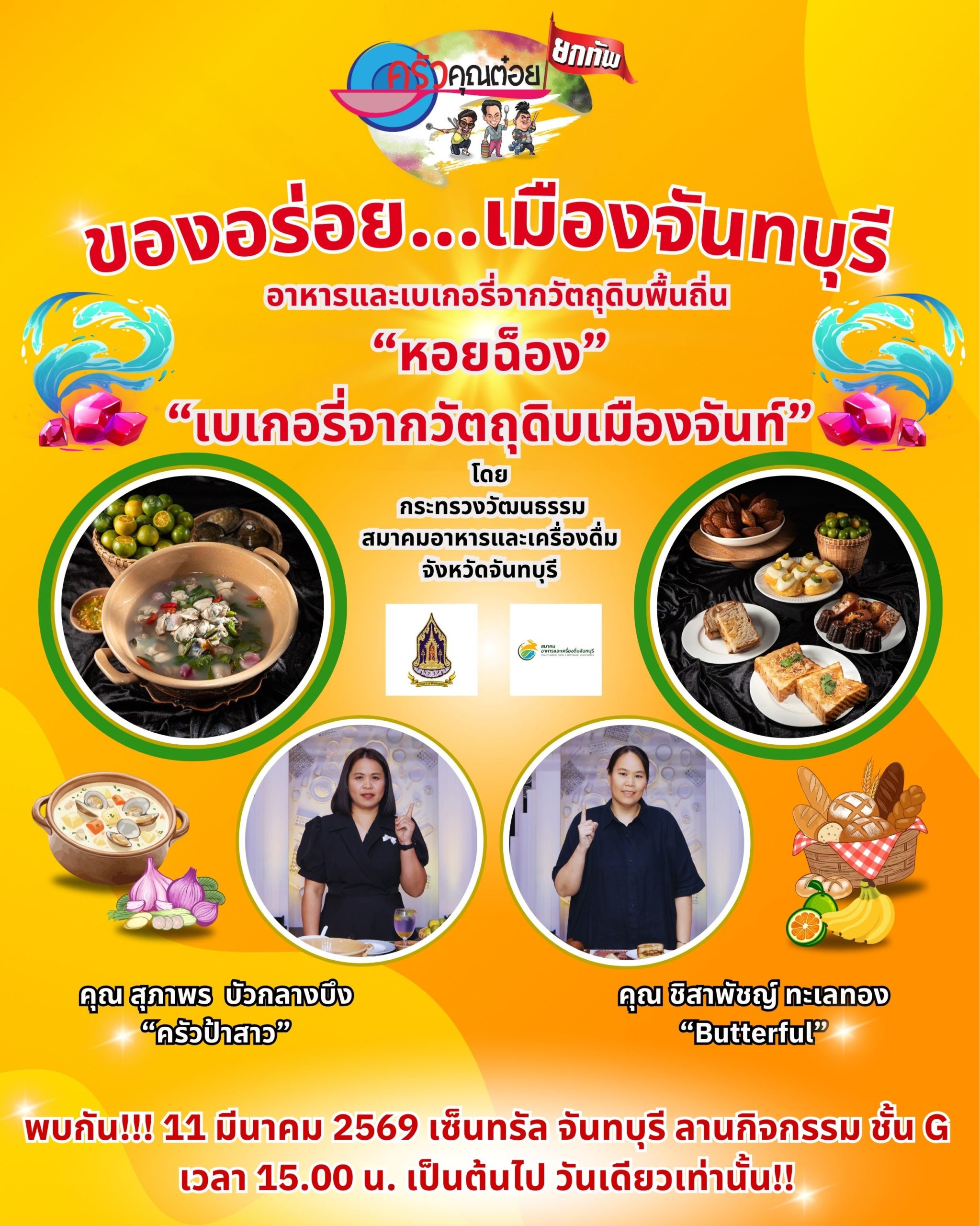 พบกับไฮไลท์เด็ดส่งเสริมอร่อยเมืองจันท์ งานนี้ได้รับความร่วมมือจากวัฒนธรรมจังหวัดจันทบุรี สมาคมอาหารและเครื่องดื่ม จังหวัดจันทบุรี นำเสนออาหารและเบเกอรี่สไตล์พื้นถิ่นสุดล้ำค่าแห่งภูมิปัญญา ได้แก่